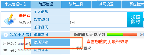 在此功能分支下有 个人信息、教育培训、工作经历、求职意向、简历预览、简历样本等子功能项